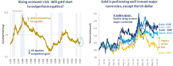 Market conditions are evolving rapidly and, with risks to economic growth rising, we see a change in fortunes ahead for the beleaguered gold sector. Higher borrowing costs, supply chain shocks and declining consumer spending, indicate slower growth ahead for economies already battered by the highest inflation since the 1970s and the residual impact of the COVID-19 pandemic. As the US rate hike cycle runs its course and policymakers’ attention shifts towards supporting slowing economies, we anticipate a return of momentum for gold and gold equities.
