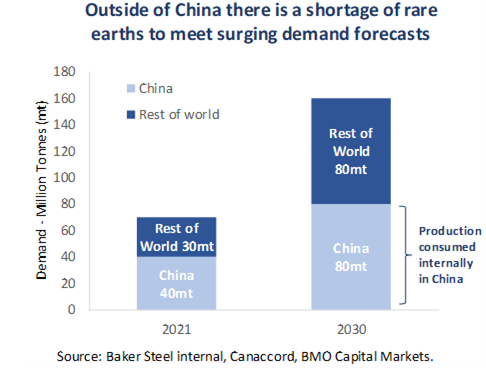 Demand for magnet rare earths is forecast to more than double by 2030, driven by the green revolution. Outside of China there is already a real issue in securing enough material and processing to magnet stage.