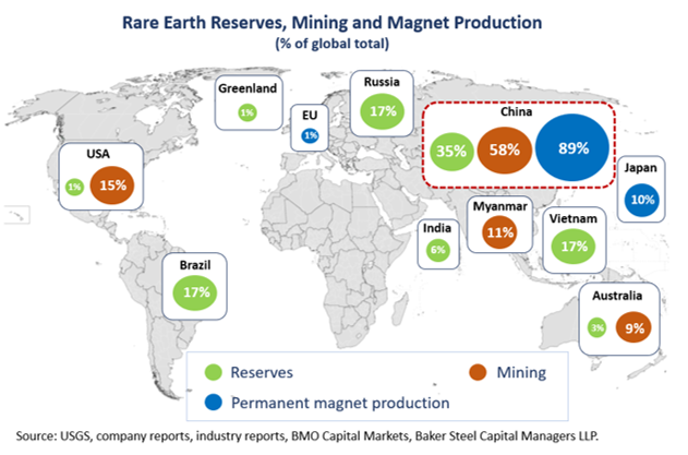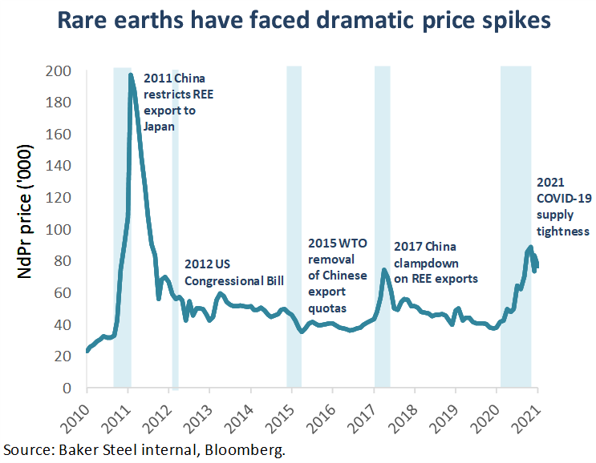 The 17 elements known as rare earths are critical for a wide range of technologies across industries globally, yet China dominates the rare earth supply chain, from active deposits to processing. Rare earth metals present a valuable example of the investment themes which we target through Baker Steel’s Electrum strategy, focusing on the “future facing” metals and materials which face surging demand from the green revolution. Given the recent fall in rare earth prices and related equities set against the robust longer-term outlook, we believe rare earths’ precarious supply dynamics present both risks and opportunities for investors: