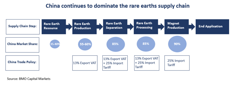 Rising geopolitical tension, particularly between the US and China, will likely place further strain on supply chains for rare earths. Securing the supply of critical materials, while protecting sensitive technologies, is increasingly difficult for governments and holds significant implications for naturals resources investors.
