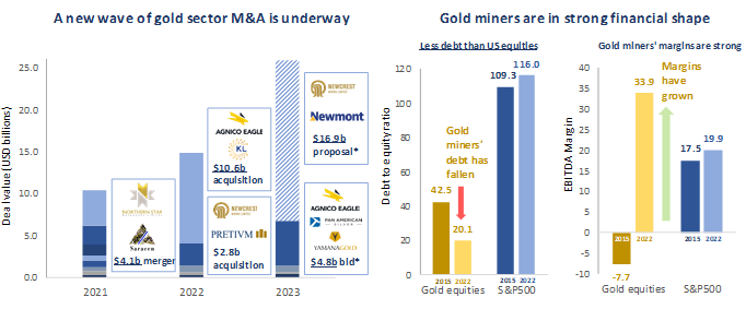 Dealmaking among gold majors is gaining pace, amid improving financial health for the sector. Gold miners compare favourably relative to broader equities in terms of margins and debt, having recovered strongly since the lows of 2015.