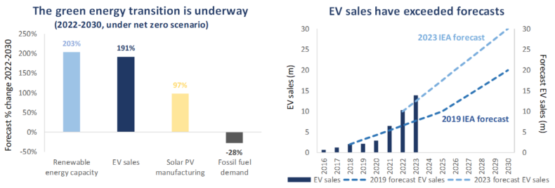 Sources: IEA, World Energy Outlook 2023 & 2019. Note, forecast EV sales based on stated policies and electric car targets of the world’s 20 largest car manufacturers. Electric vehicles comprise of battery electric vehicles (BEV) and plugin hybrid vehicles.