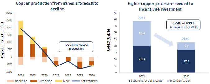 Imminent deficit – The copper market is in deficit in 2024, with this shortfall projected to deepen in the years ahead. Without higher prices, the copper market is forecast to reach a 9% supply deficit by 2030.