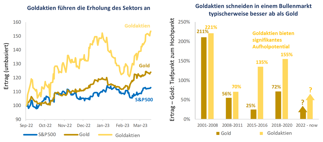 Quelle:Bloomberg, Baker Steel Capital Managers LLP. Daten in USD; Stand: 12. April2023. Bitte beachten: Goldaktien sind durch den XAU Index repräsentiert.