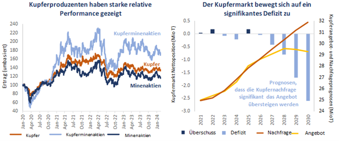 Nur wenige Metalle haben eine solche Bedeutung für die Weltwirtschaft wie Kupfer. Als wichtiges Industriemetall gibt der Kupfermarkt oft Aufschluss über die Gesundheit der globalen Wirtschaftsaussichten. Doch gerade die Rolle des Metalls bei der Elektrifizierung rückt es in den Mittelpunkt der grünen Energiewende. Neben einer Reihe anderer Spezialmetalle sieht sich Kupfer in naher Zukunft mit steilen Nachfrageprognosen konfrontiert, während sich die langfristigen Nachfragetrends verändern. Der derzeitige gemischte Marktkonsens für Kupfer, der auf schwachen Wirtschaftswachstumsaussichten beruht, könnte sich angesichts zunehmender Angebotsengpässe drastisch ändern. Da der Kupfermarkt im Jahr 2024 in ein Defizit eintritt, sind wir der Ansicht, dass die kurzfristigen Chancen deutlich zugunsten eines Kupfer-„Squeeze“ und einer Outperformance der Kupferminenunternehmen verschoben sind.