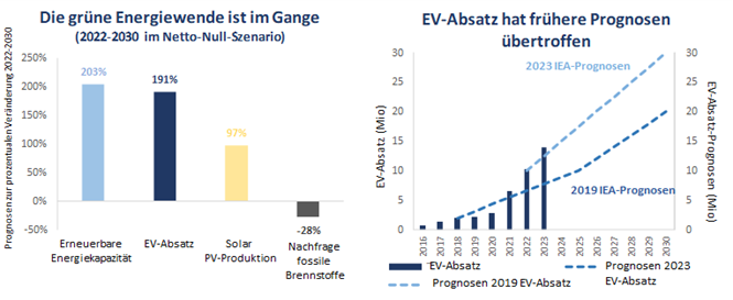 Quellen: IEA, Weltenergieausblick 2023 und 2019. Hinweis: Die prognostizierten Verkäufe von Elektrofahrzeugen (EV) basieren auf der erklärten Politik und den Elektroautozielen der 20 größten Automobilhersteller der Welt. Elektrofahrzeuge umfassen batteriebetriebene Elektrofahrzeuge (BEV) und Plug-in-Hybridfahrzeuge.