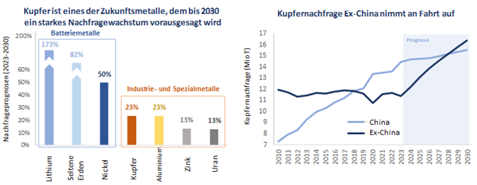 Höhere Nachfrage – Es wird prognostiziert, dass die Kupfernachfrage bis 2030 um 23 % steigen wird, angetrieben durch die Energiewende und eine breitere industrielle Nutzung. Vor allem die Kupfernachfrage außerhalb Chinas wird sich voraussichtlich beschleunigen.