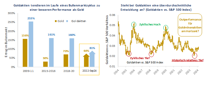 In früheren Zyklen hat die Kombination aus steigenden Gewinnspannen der Minengesellschaften und dem Wiederaufleben der ETF-Käufe den Goldpreis in die Höhe getrieben und den Edelmetallminengesellschaften Auftrieb gegeben. Angesichts dieser Faktoren sind die Voraussetzungen dafür gegeben, dass Goldaktien in der nächsten Phase des Bullenmarktes eine deutlich bessere Performance als physisches Gold erzielen werden. Wir sind der Meinung, dass dieses Umfeld für Stockpicker ideal sein wird.