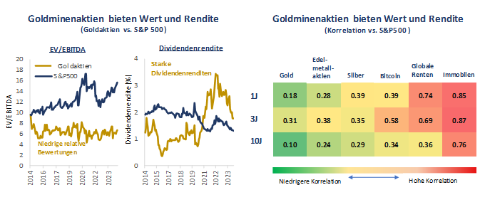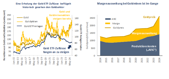 Zum jetzigen Zeitpunkt des Zyklus sind die Ausweitung der Margen und eine Wiederbelebung der Anlegerstimmung die wichtigsten Faktoren für Edelmetallaktien. Die Margen der Minengesellschaften werden sich 2024 ausweiten, da Edelmetallpreise stärker steigen als die Kosten. Mit durchschnittlichen nachhaltigen Gesamtkosten („AISC“) für die Produktion einer Unze Gold von knapp über 1.400 US$/Unze und einem Goldpreis von derzeit 2.600 US$/Unze ist die Rentabilität des Sektors hochiv. Die Kosten steigen zwar, doch hat sich das Tempo der Inflation in den letzten zwei Jahren deutlich verlangsamt. Bestimmte Kosten, wie z. B. staatliche Abgaben, sind unvermeidlich, doch die Kostenkontrolle wurde insgesamt gut gehandhabt, unterstützt durch Technologie und eine anhaltende Konzentration auf Kapitaldisziplin. Diese Rentabilitätsverbesserung findet vor dem Hintergrund einer Erholung der Anlegerstimmung gegenüber Edelmetallminen statt. Die Zuflüsse sowohl in physisches Gold als auch in börsengehandelte Goldaktienfonds nehmen nach drei Jahren mit Nettoabflüssen wieder zu. Wir glauben, dass sich dieser Trend fortsetzen wird, da sich die monetären Bedingungen zu lockern beginnen, was eine Rotation weg von Wachstumswerten hin zu Substanzwerten beschleunigen könnte. Dies ist von großer Bedeutung für den Edelmetallsektor, der im Vergleich zu den breiteren Aktienmärkten weiterhin deutlich unterbewertet ist.