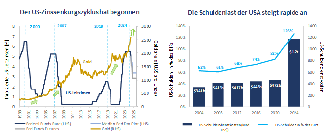 Angesichts der bevorstehenden US-Wahlen, der Lockerung der Geldpolitik und der weltweit gestiegenen wirtschaftlichen und politischen Risiken dürfte die Dynamik im Edelmetallsektor anhalten. Von den Zentralbanken der Schwellenländer bis hin zu Kleinanlegern in den USA und Asien ist die Nachfrage nach physischem Gold weiterhin stark. Da sich westliche Institutionen allmählich wieder in diesem Sektor engagieren, erwarten wir, dass die Nachfrage in den kommenden Monaten weiter steigen wird. Die US-Präsidentschaftswahlen werden im vierten Quartal 2024 ein beherrschendes Thema an den Märkten sein. Die Wahl zwischen Trump und Harris hat erhebliche Auswirkungen auf den Rohstoffsektor, insbesondere in Bezug auf die Aussichten für Handelskriege und die Umstellung auf grüne Energie in den USA. Ein Sieg Trumps würde die Unsicherheit über die Zukunft des Inflation Reduction Act erhöhen, doch da viele Nutznießer dieser Politik in roten Bundesstaaten angesiedelt sind, könnten die Änderungen geringer ausfallen als befürchtet. Was den Edelmetallsektor betrifft, so sind wir der Ansicht, dass die wichtigsten Einflussfaktoren für Gold und Silber weitgehend vom Wahlergebnis unabhängig sind. Keiner der beiden Kandidaten befürwortet eine signifikante Reduzierung der Ausgaben oder eine Verringerung der Verschuldung, was darauf hindeutet, dass der langfristige Trend zur Abwertung des US-Dollars wahrscheinlich anhalten wird. Der Schuldendienst der USA beläuft sich inzwischen auf über 1,2 Billionen USD pro Jahr, und es gibt keinen glaubwürdigen Plan zur Verringerung dieser Belastungvii. In der Zwischenzeit sind viele Zentralbanken der Schwellenländer, insbesondere der BRICS-Staaten, aktiv dabei, sich von US-Staatsanleihen zu trennen und gleichzeitig ihre Goldreserven zu erhöhen.
