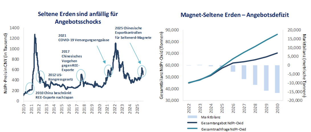 Keine andere Rohstoffgruppe steht so sehr für die strategischen Herausforderungen und Chancen im Bereich der kritischen Metalle wie die Seltenen Erden, die an der Schnittstelle zwischen Elektrifizierung, Verteidigung und Hochleistungselektronik angesiedelt sind. Von diesen 17 Elementen sind insbesondere die Magnetmetalle sehr gefragt. Als Gruppe weisen Seltene Erden ähnliche geochemische Eigenschaften auf und kommen geologisch zusammen vor. Sie werden gemeinsam abgebaut und mehreren Verarbeitungsschritten unterzogen, bevor sie durch mehrere zusätzliche chemische Prozesse in einzelne Oxide getrennt werden. Der Sektor sieht sich in den kommenden Jahren mit einem Versorgungsdefizit konfrontiert, während die Preise in der Vergangenheit aufgrund von Risiken auf der Angebotsseite und geopolitischen Faktoren häufig stark angestiegen sind.