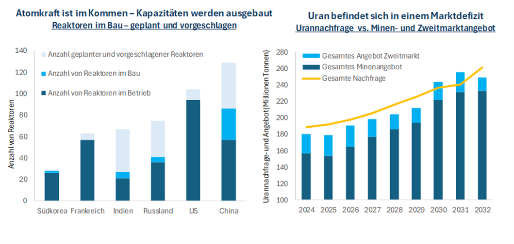 Wir wenden uns nun dem Uransektor zu, dessen Lage sich in den letzten Jahren dramatisch verändert hat, da Kernenergie sowohl von Regierungen als auch vom privaten Sektor wieder verstärkt unterstützt wird. Die Nachfrage nach Uran wird bis 2030 voraussichtlich um 39 % steigenxvi, angetrieben durch Dekarbonisierungs- und Energiesicherheitsziele, die die Lebensdauer bestehender Reaktoren verlängern, die Wiederinbetriebnahme stillgelegter Reaktoren ermöglichen und eine neue Welle von Reaktorbauprojekten unterstützen, sowohl bei Großkraftwerken als auch bei kleinen modularen Reaktoren (SMR). Kernkraftkapazitäten werden erneut ausgebaut, angeführt von China, Indien und Russland, begleitet von einer erneuten politischen Unterstützung in den USA. Auch in Europa hat sich die politische Stimmung gewandelt: Das schwedische Parlament hat diesen Monat beschlossen, das Verbot des Uranabbaus ab 2026 aufzuheben, und Länder wie Frankreich, Belgien und die Niederlande führen eine Verlängerung der Reaktordauer oder den Neubau von Reaktoren durch bzw. erwägen dies.