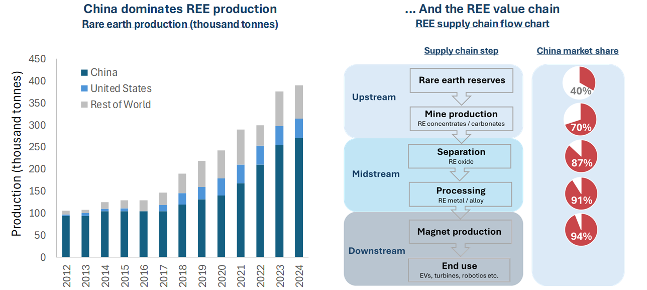 Über die industrielle Nutzung hinaus ist auch die Nachfrage der Regierung nach REE-Magneten beträchtlich. Es wird erwartet, dass das US-Verteidigungsministerium seinen Bedarf an NdFeB-Magneten von derzeit ca. 200 Tonnen pro Jahr bis 2030 auf 500 bis 1.500 Tonnen pro Jahr steigern wirdvii. Die strategische Bedeutung von Seltenen Erden und die Anfälligkeit ihrer Lieferketten wurden von Präsident Trump während seiner beiden Amtszeiten neben allgemeinen Bedenken hinsichtlich der Sicherheit der Versorgung mit kritischen Mineralien in den Fokus gerückt. Während Chinas Dominanz in den Lieferketten für kritische Mineralien allgemein bekannt ist, stellen Seltene Erden aufgrund ihrer strategischen Bedeutung für Verteidigung, Energie und Spitzentechnologien eine besonders akute Herausforderung dar.