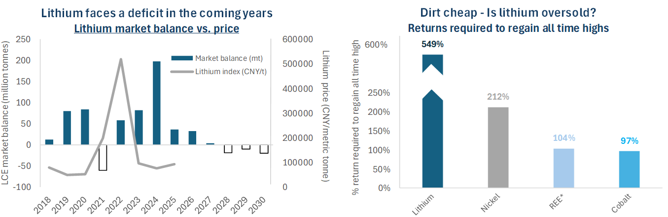 Wir sehen auch Anzeichen für strategische Produktionskürzungen seitens der Lithiumproduzenten, was die Verknappung auf dem Markt beschleunigen könnte. Im August 2025 stellte CATL (Contemporary Amperex Technology Co) vorübergehend 46 kt LCE-Kapazität ein, was etwa 3 % des weltweiten Angebots für 2025 entsprichtxxx. Unterdessen kündigte Albemarle, der weltweit größte Lithiumproduzent, die Stilllegung seines Lithiumhydroxid-Werks in Chengdu sowie die Verzögerung oder Streichung mehrerer Expansionsprojekte anxxxi. Diese Kürzungen stellen bedeutende Mengen dar und könnten den Markt schneller als erwartet wieder in ein Defizit bringen, insbesondere wenn weitere Produzenten diesem Beispiel folgen. Die jüngste Erholung des Sektors unterstreicht auch, wie schnell sich die Stimmung und die Fundamentaldaten ändern können, wenn die Nachfrage steigt, beispielsweise durch den verstärkten Einsatz von Netzspeichern oder eine mögliche erneute Beschleunigung der Elektrofahrzeugverkäufe. Ein künftiger Wiederauffüllungszyklus nach dem Abbau der Lagerbestände in den letzten zwei Jahren würde einen zusätzlichen Katalysator für die Erholung darstellen.